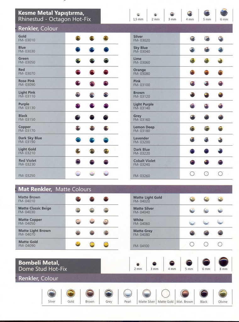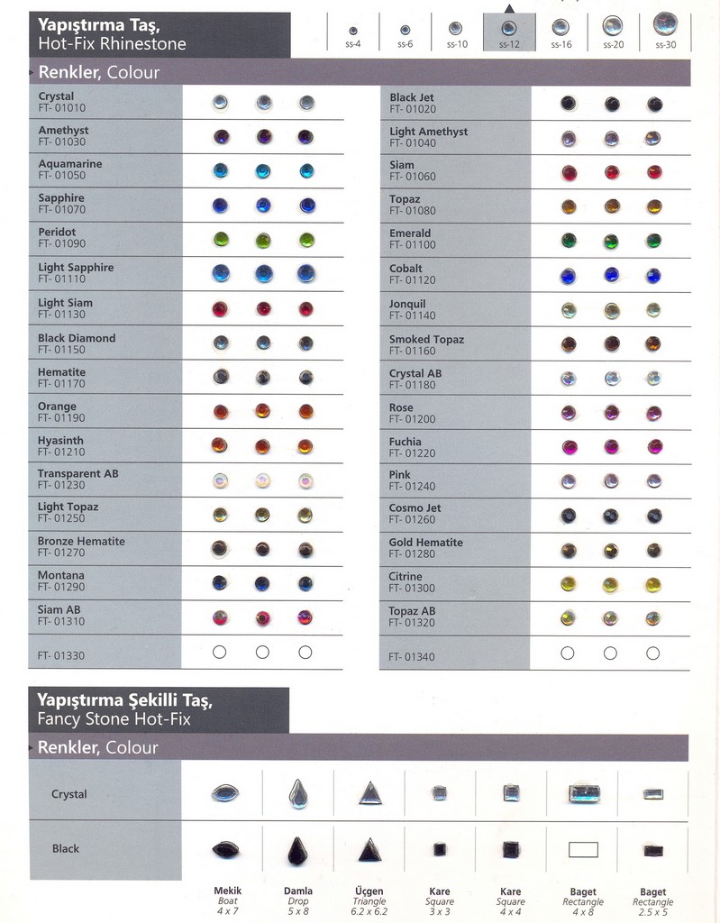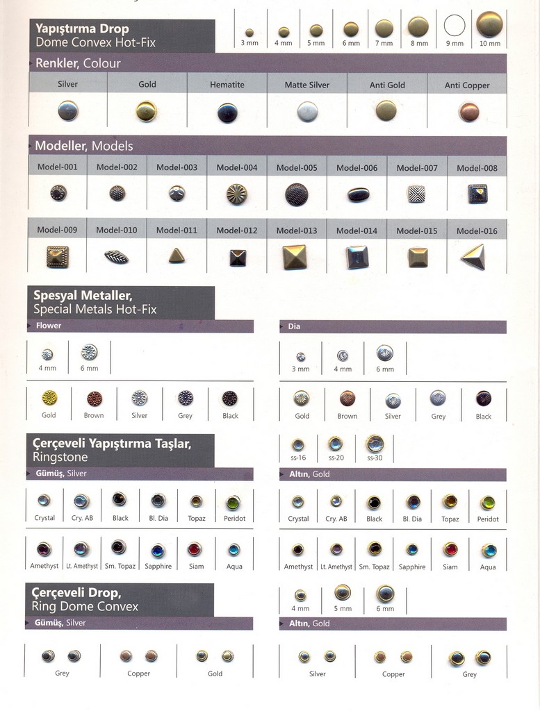 Фирмата предлага голямо разнообразие от кристални и метални камъни в различни цветове и големини: